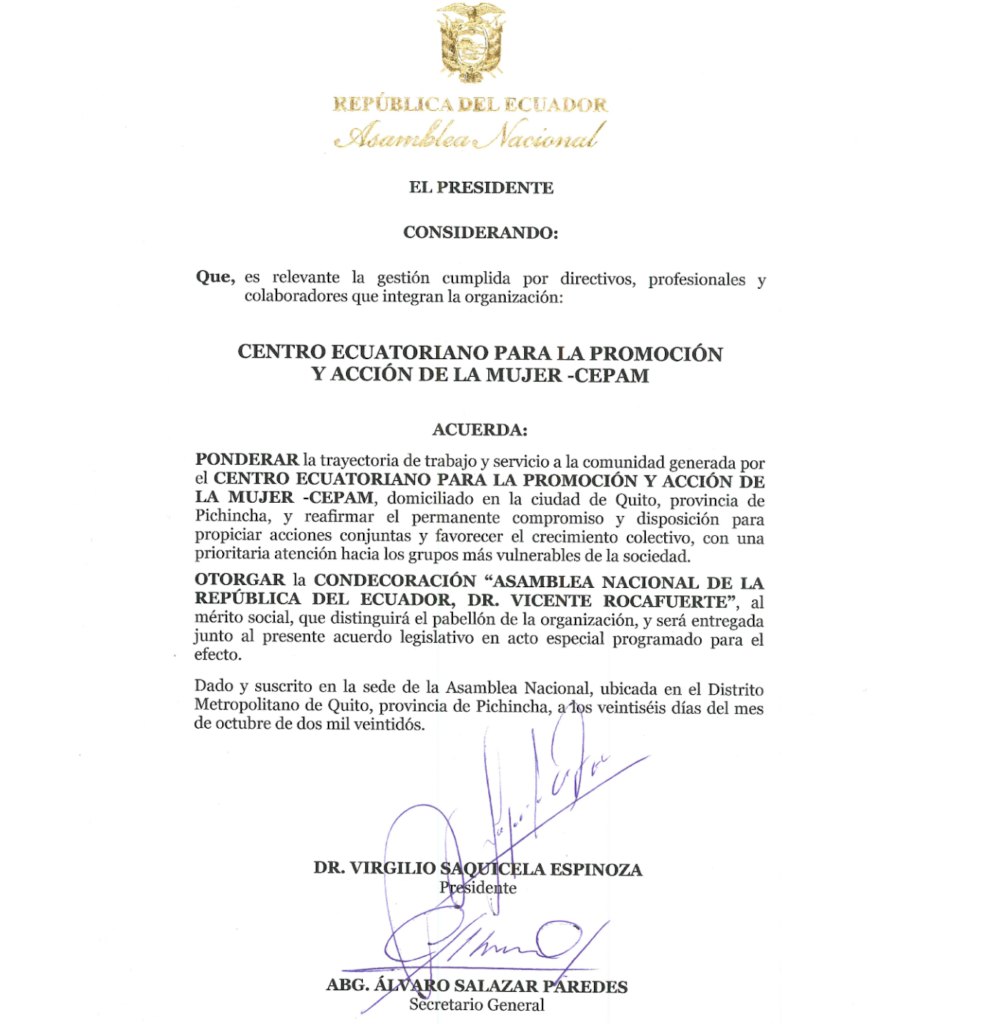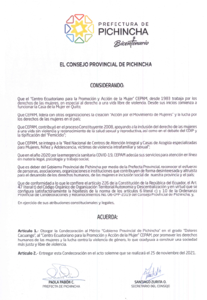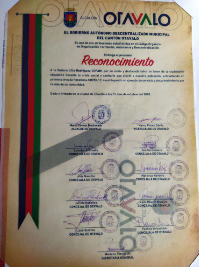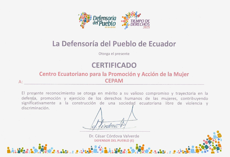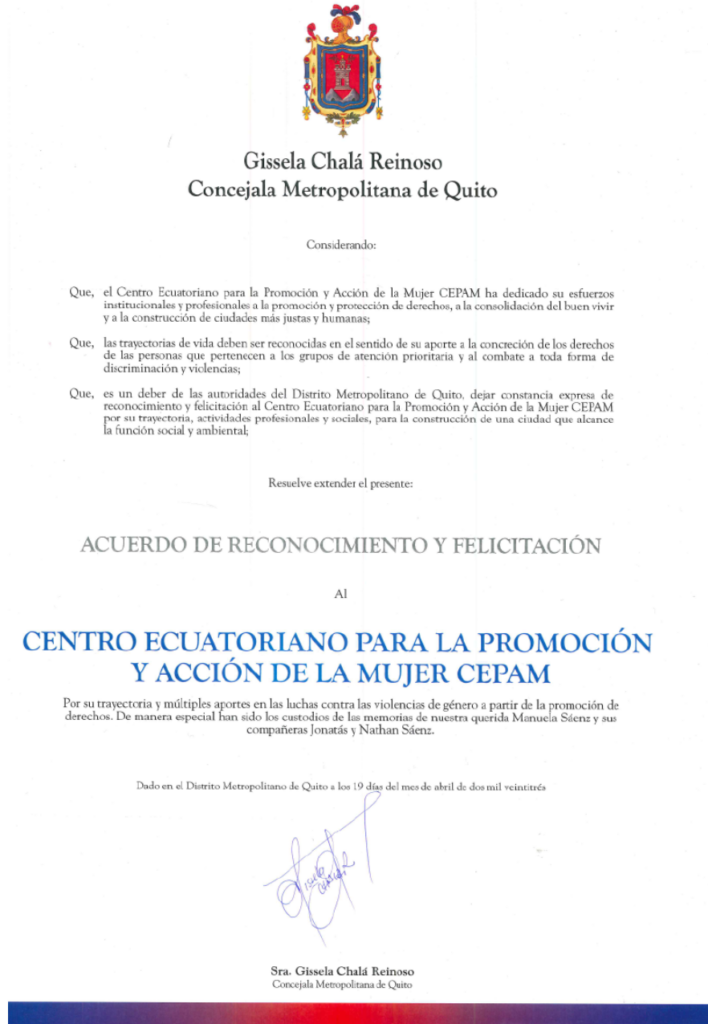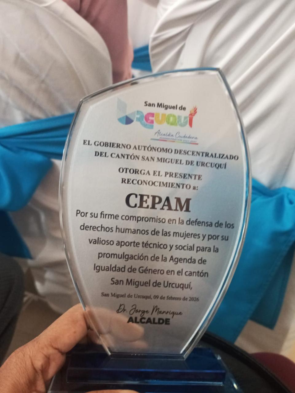 CEPAM recibe reconocimiento por parte del Alcaldía Ciudadana de Urcuquí por su compromiso en la defensa de los derechos humanos de las mujeres y por su aporte técnico y social para la promulgación de la Agenda de Igualdad de Género en el cantón San Miguel de Urcuquí.