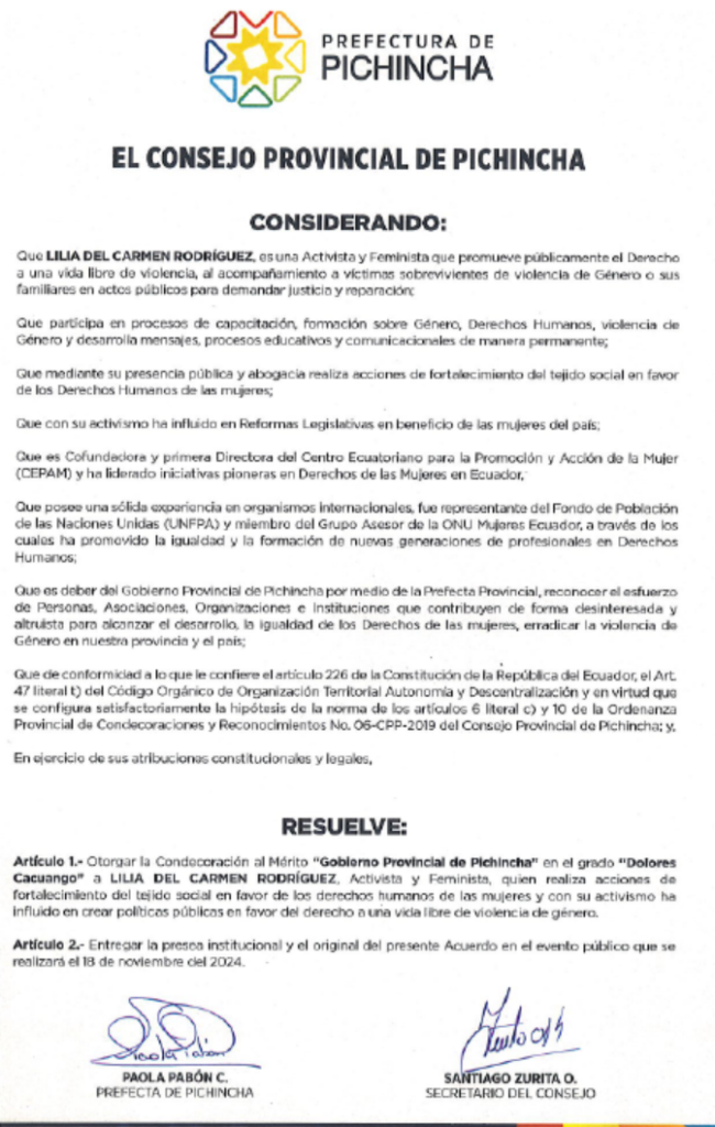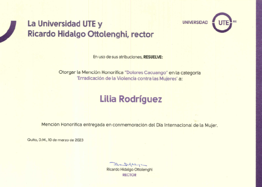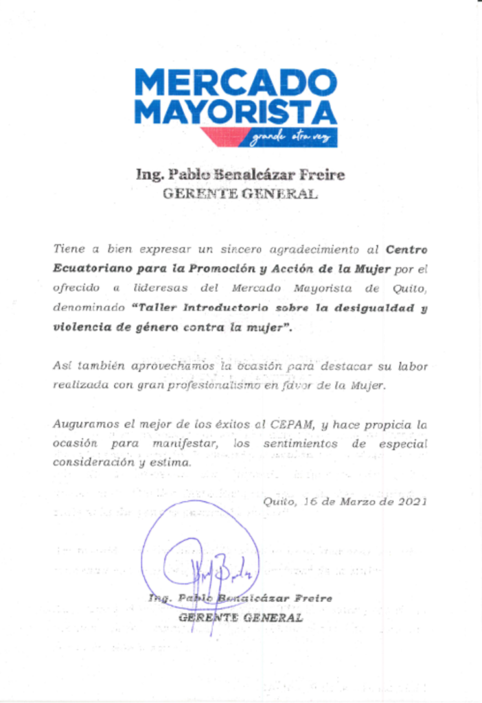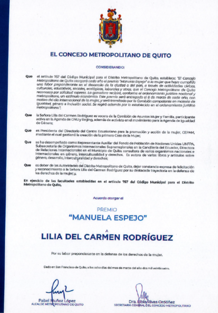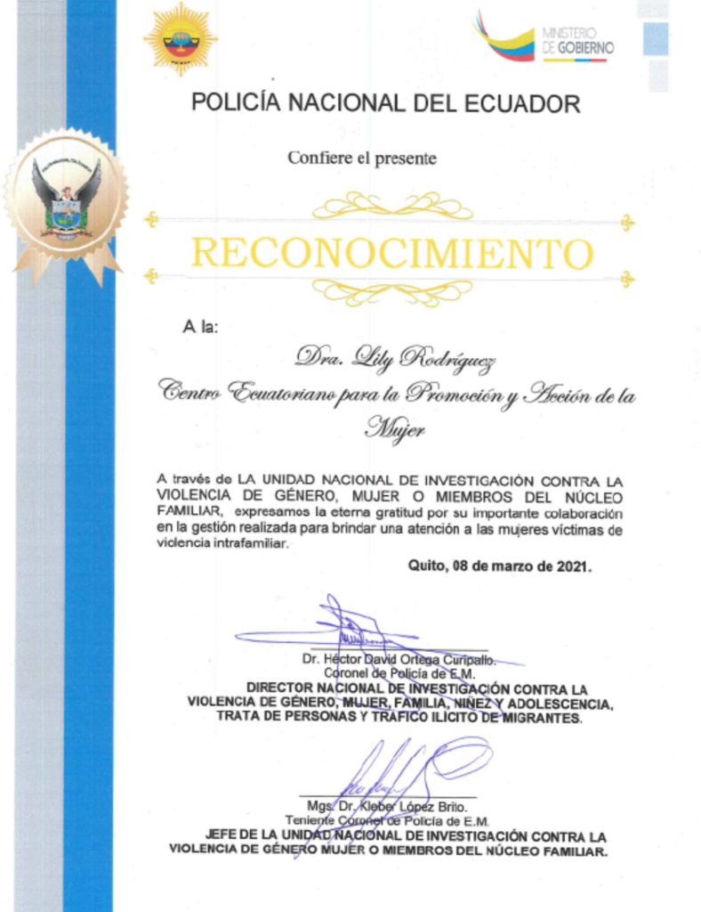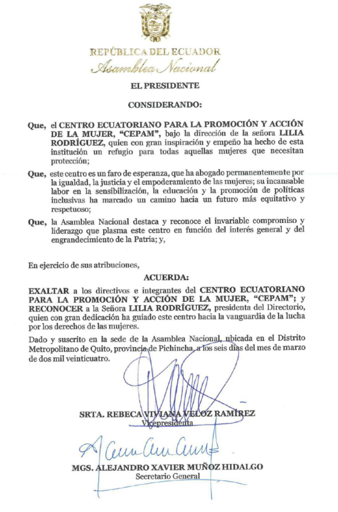 CEPAM recibe reconocimiento por parte del Alcaldía Ciudadana de Urcuquí por su compromiso en la defensa de los derechos humanos de las mujeres y por su aporte técnico y social para la promulgación de la Agenda de Igualdad de Género en el cantón San Miguel de Urcuquí.